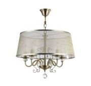 Металлическая арматура в двух оттенках на выбор: латунь и никель. Абажуры – текстиль белого цвета. Декоративные элементы из прозрачного стекла. Источник света – лампа с цоколем E14.