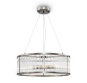 Арматура из металла. Основной цвет — чёрный, декоративные элементы в цвете латунь. Тканевые бежевые абажуры-цилиндры украшены чёрными металлическими основаниями. Компактные размеры для невысоких потолков. Источник света — лампа с цоколем Е14.